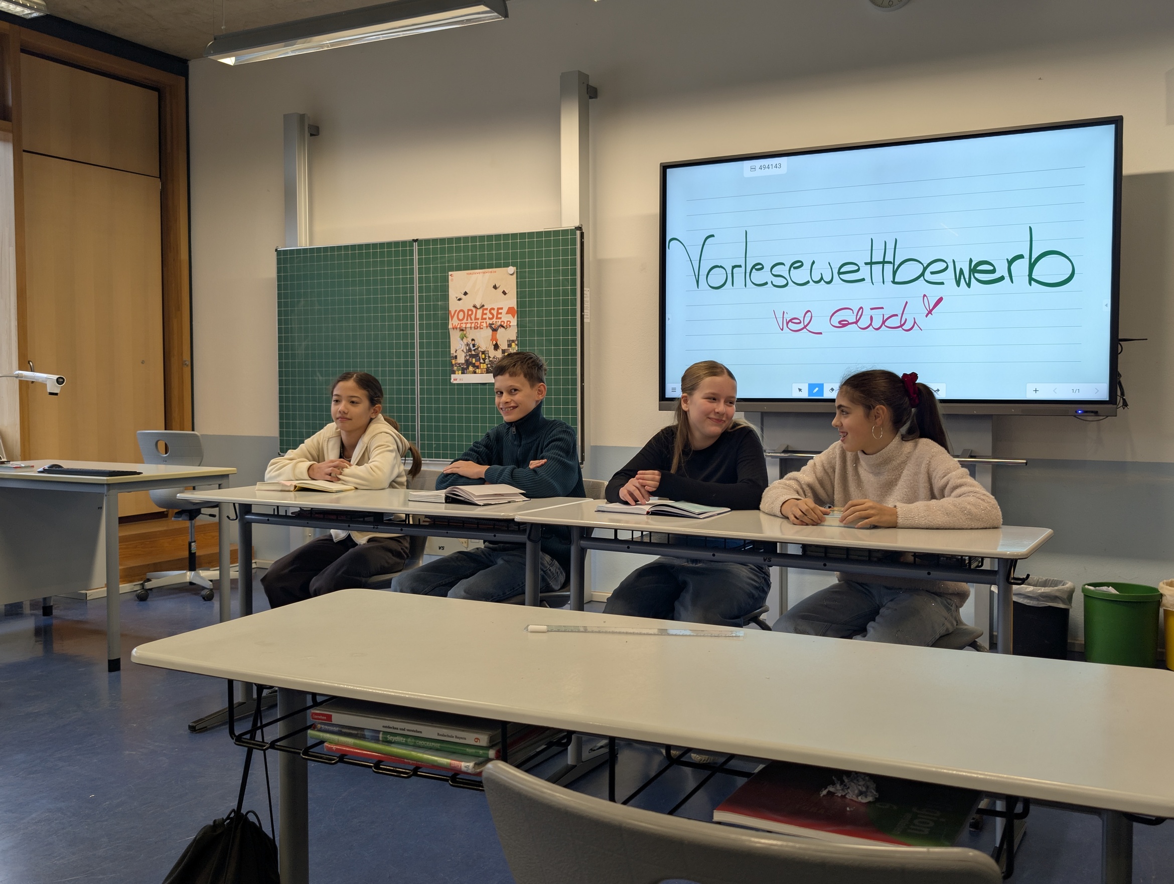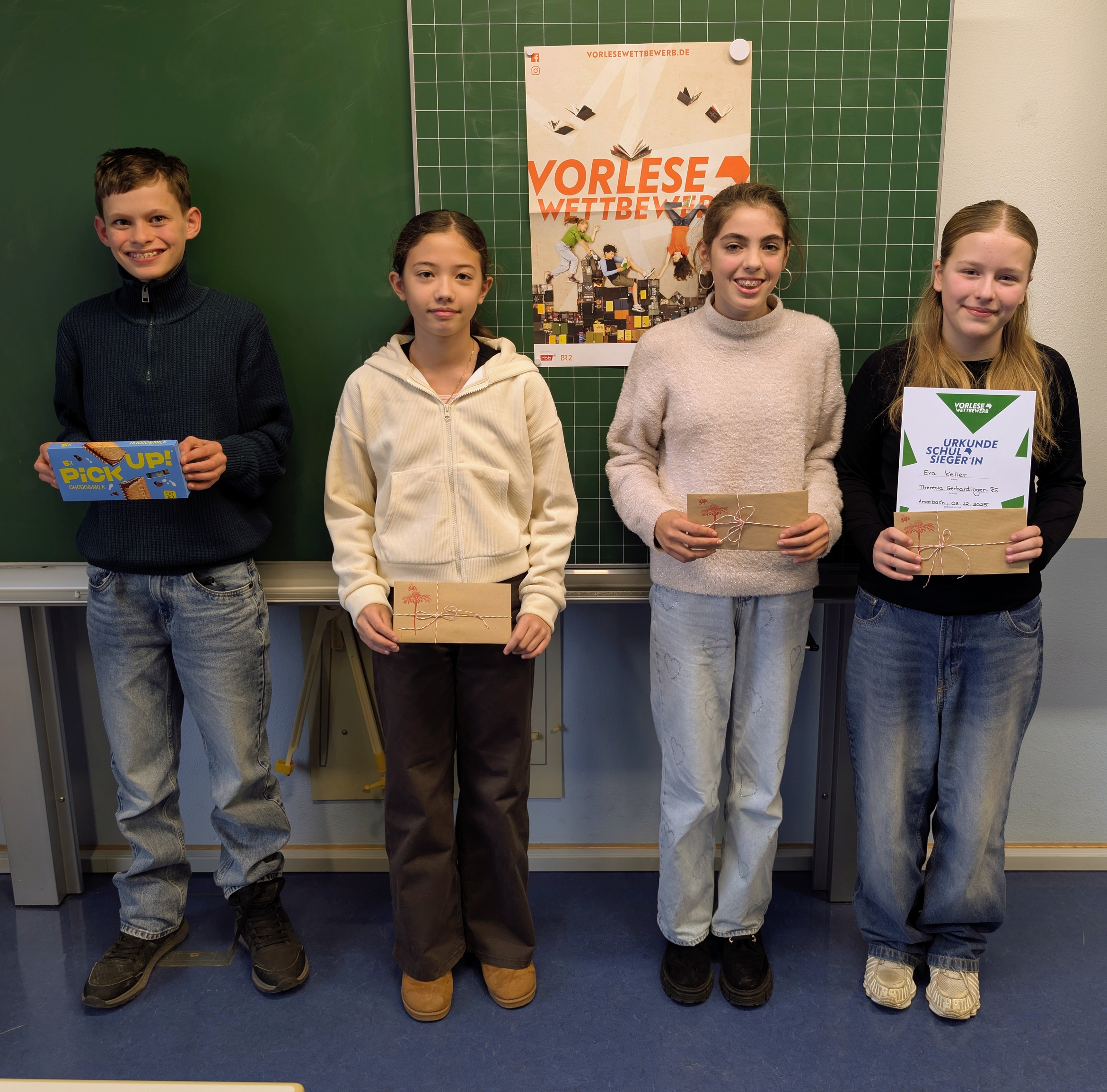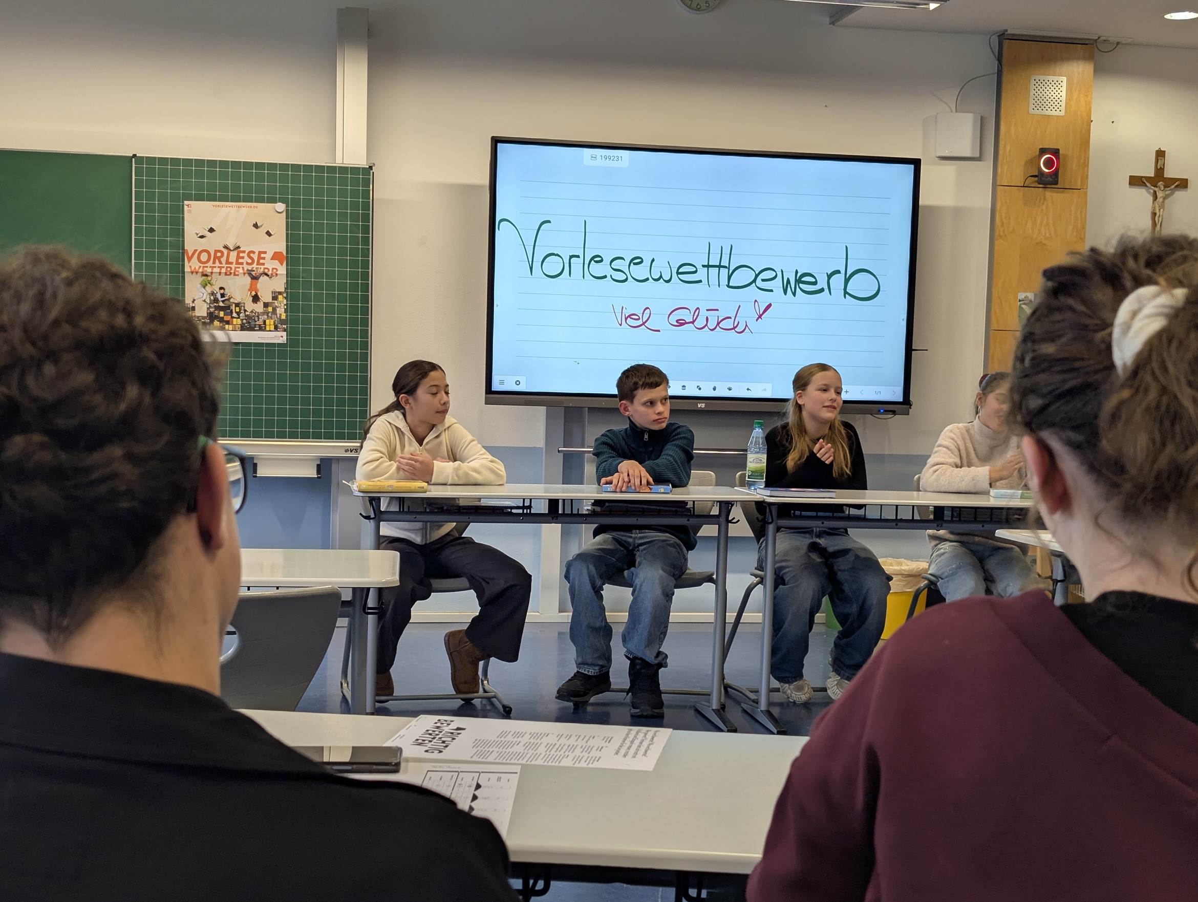 In diesem Jahr gab es vier Kandidaten, die im Vorlesen gegeneinander antraten. Als Klassenbeste traten aus der Klasse 6A Eva Keller und Greta Trumpf gegen die Klassensieger der Klasse 6B Marisa Almeida Gravano und Lars Wörner an.
